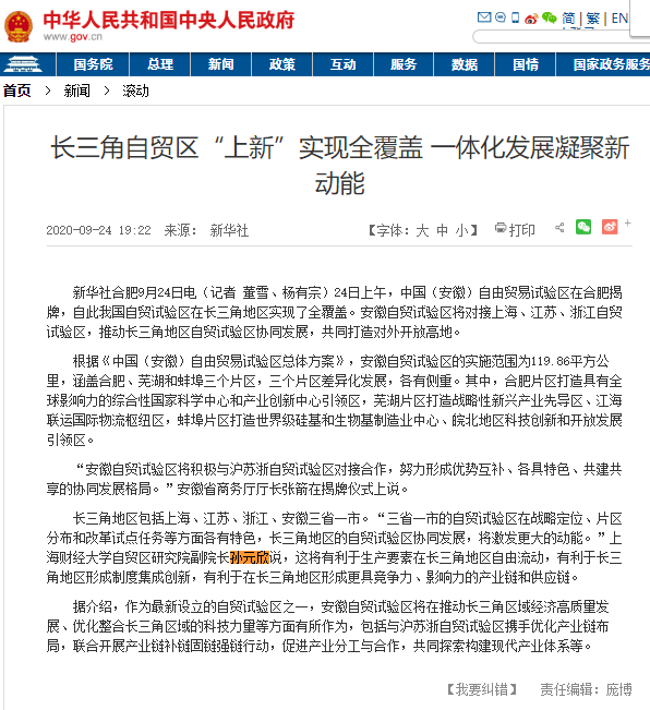当日,协同创新中心首席专家、上海财经大学自贸区研究院副院长孙元欣教授接受《新华社》采访,并获国务院官网转载,谈长三角自贸区“上新”实现全覆盖,一体化发展凝聚新动能。