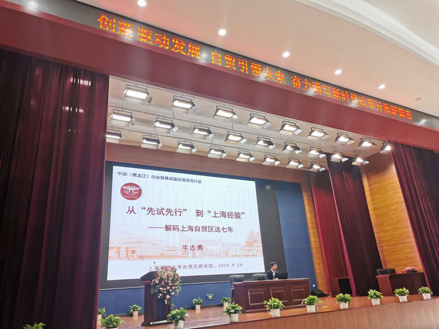 2020年9月24日,协同创新中心专家、上海财经大学自贸区研究院牛志勇老师受邀参加 “黑龙江自贸试验区主题论坛活动”。在“创新论坛”环节,牛志勇老师作了题为《从“先试先行”到“上海经验”——解码上海自贸区这七年》的主题演讲,主要围绕上海自贸区建立七周年以来,解读了上海的发展历程和相关经验,尤其从投资管理制度、贸易监管制度、金融创新制度以及事中事后监管制度等方面进行了分析,从政府职能部门如何“放得更活”、“管的更好”、“服务更优”等方面进行了讨论,最后并结合绥芬河片区自身情况,提出了该片区发展的建设性意见。