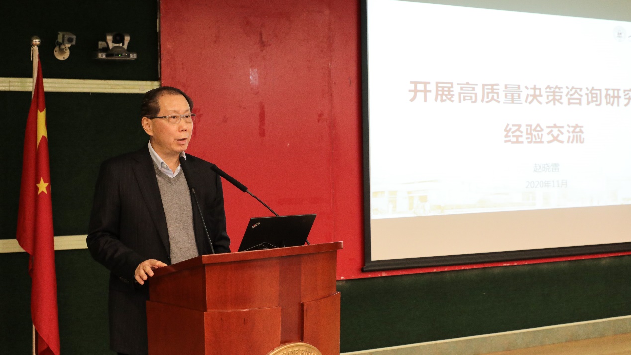 在交流发言环节,赵晓雷教授结合自己丰富的决策咨询工作经历,运用大量生动的决策咨询工作案例,分别从如何贯通国家战略研究与实践应用研究、决策咨询研究成果如何有效转化、如何践行“经济匡时”资政启民等方面作了题为《开展高质量决策咨询研究的经验交流》的分享交流。