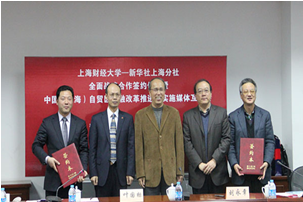 新华社上海分社与上海财经大学签署战略合作框架协议,根据协议,双方将在共建金融实验室、联合培养金融创新人才、共同开展课题研究等方面展开合作,为上海“四个中心”建设提供智力支撑,进一步提升上海金融软实力。上海市现代服务业联合会会长、原上海市副市长、上海市人大常委会副主任周禹鹏,上海财经大学党委书记丛树海,党委副书记刘永章,上海国际金融中心研究院执行院长赵晓菊,新华社上海分社社长陈良杰,副社长叶国标等出席签约仪式。新华社上海分社副社长叶国标、上海财经大学党委副书记刘永章代表双方签约。