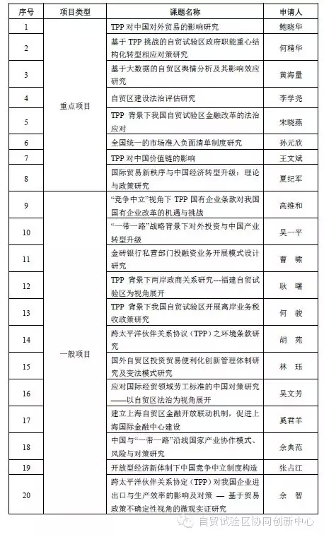 经过征集,中国自由贸易试验区协同创新中心2015年下半年招标课题共收到申请27份,其中11项重点项目申请、16项一般项目申请,主题涉及自贸试验区投资、贸易、金融、法治、行政管理、一带一路、TPP、金砖银行等方面。