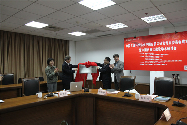 随后,姚玲珍校长助理、孙久文理事长、赵晓雷副理事长和沈体雁秘书长共同为中国区域科学协会中国自贸区研究专业委员会揭牌。