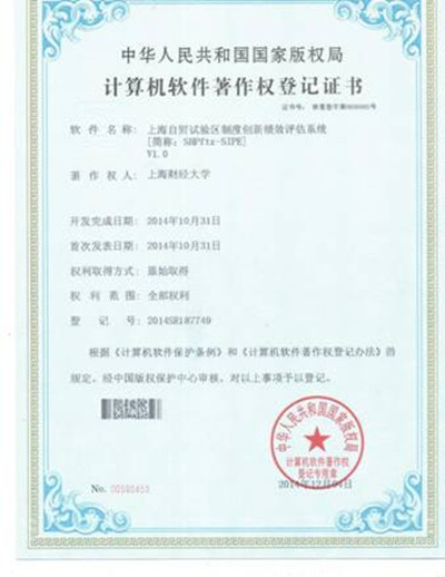 项目团队具体设计了 “上海自贸试验区制度创新绩效综合评估方法” ,并开发了 “上海自贸试验区区制度创新指标量化绩效评估系统” 软件平台。其中,“上海自贸试验区区制度创新指标量化绩效评估系统(SHPftz-SIPE V1.0)”软件平台于12月4日获得了国家版权局颁发的《计算机软件著作权登记证书》(软著登字第0856985号)。该系统具有指标库、数据录入和绩效评估三大功能。指标体系是根据国务院《总体方案》列明的自贸试验区总体目标和主要建设任务,以及上海市人大常委会通过的《自贸试验区条例》对主要建设任务的分解,参考有代表性的国际第三方机构评估指标而设计的。对绩效指标体系作参量化处理后录入评估系统,进行绩效评估。