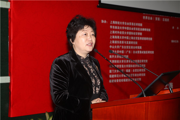 上海财经大学校长樊丽明教授致辞。她代表上海财经大学向出席论坛的各位来宾表示衷心的感谢和热烈的欢迎。指出,中国自由贸易试验区的建立是党中央、国务院的一个重要决策。从上海开始到1+3格局的形式,我们看到的是大家对中国自由贸易试验区的无限期待。自贸试验区不仅承载着以改革、开放、发展为主题的重要的试验使命,而且承载着大家对改革、开放、发展的重大希望。自贸试验区不同于自由贸易区,首先它是一个全面深化改革的试验田,在政府职能转变方面,在贸易便利化方面,在投资自由化方面,在金融市场化方面,在营商环境的法制化、规范化方面,要做出一些示范,一些探索。同时我们也看到在新的国际形势下,更高标准的国际经贸新规则也需要在一定区域里面试验、适应。放开眼界,新的适应开放的新规则、新体制究竟怎么形成,也需要试验。改革开放最终的目的是促进转型发展,中国自贸试验区是一个重大的试验,对学界以及学界和政界的结合都是一个重大的课题。回顾一年来各兄弟学校所取得的成绩,她表示,大家积极回应,在学校层面、学院层面成立了研究中心、研究院,并且整合协同,在理论探索、政策研究、人才培养、服务社会等方面初显成效。樊丽明校长希望通过本次论坛为大家搭建一个平台,通过这个平台交流各方未来进行基础理论研究、政策研究以及在育人方面的一些新点、亮点,通过相互交流能够共同提高。
