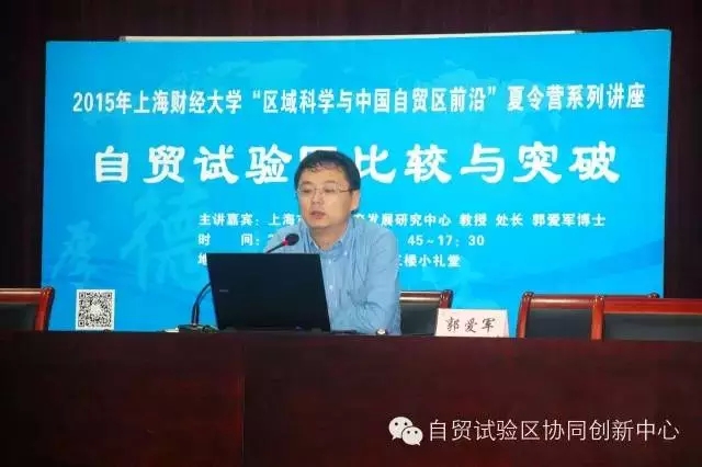 随后,上海市人民政府发展研究中心开放研究处处长郭爱军教授为大家做了题为“自贸试验区比较与突破”的专题讲座。郭处长首先介绍了我国建立自由贸易试验区的国际、国内背景,然后对各个自由贸易试验区进行了解读,最后对自由贸易试验区的未来突破方向做出了展望。