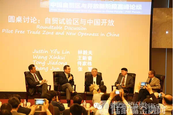 5月15日至16日,由上海财经大学国际工商管理学院、中国自由贸易试验区协同创新中心、中国金融信息中心、上海陆家嘴管委会、海银财富联合主办,北京大学国家发展研究院、清华大学国际经济研究中心协办的“中国自由贸易区与开放新阶段”高峰论坛在中国金融信息中心举办,期间,林毅夫、王新奎、佟家栋、张军进行了主题为“自贸试验区与中国开放”的圆桌讨论。