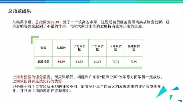 结果显示:综合总指数为80.39,处于较高的水平。分区域来看,上海自贸区指数为81.35,领先于其它三个自贸区,具有一定的先行先试优势,广东、天津和福建分别为80.58、79.71和79.90,后成立的自贸区与上海发展差距在缩小,三地自贸区在学习上海的同时也有着自身的发展特色。