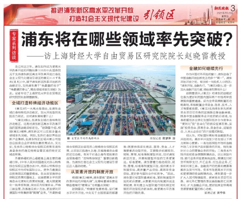 2021年7月23日, 协同创新中心首席专家、上海财经大学自贸区研究院院长赵晓雷教授接受《新民晚报》采访,谈当好开路先锋,浦东将在哪些领域率先突破?同时,该内容被《学习强国》转载。