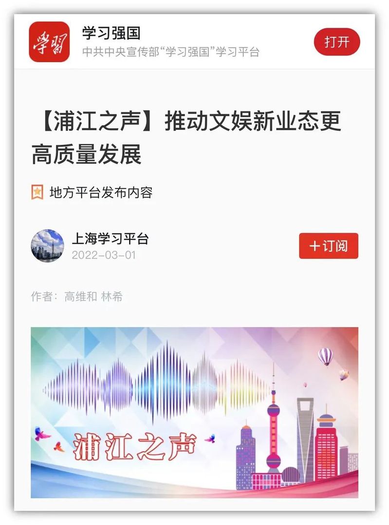 2022年3月1日,协同创新中心专家、上海财经大学高维和教授在《解放日报》上发表文章,谈推动文娱新业态更高质量发展。同时,该文章被《学习强国》转载。文章内容如下: